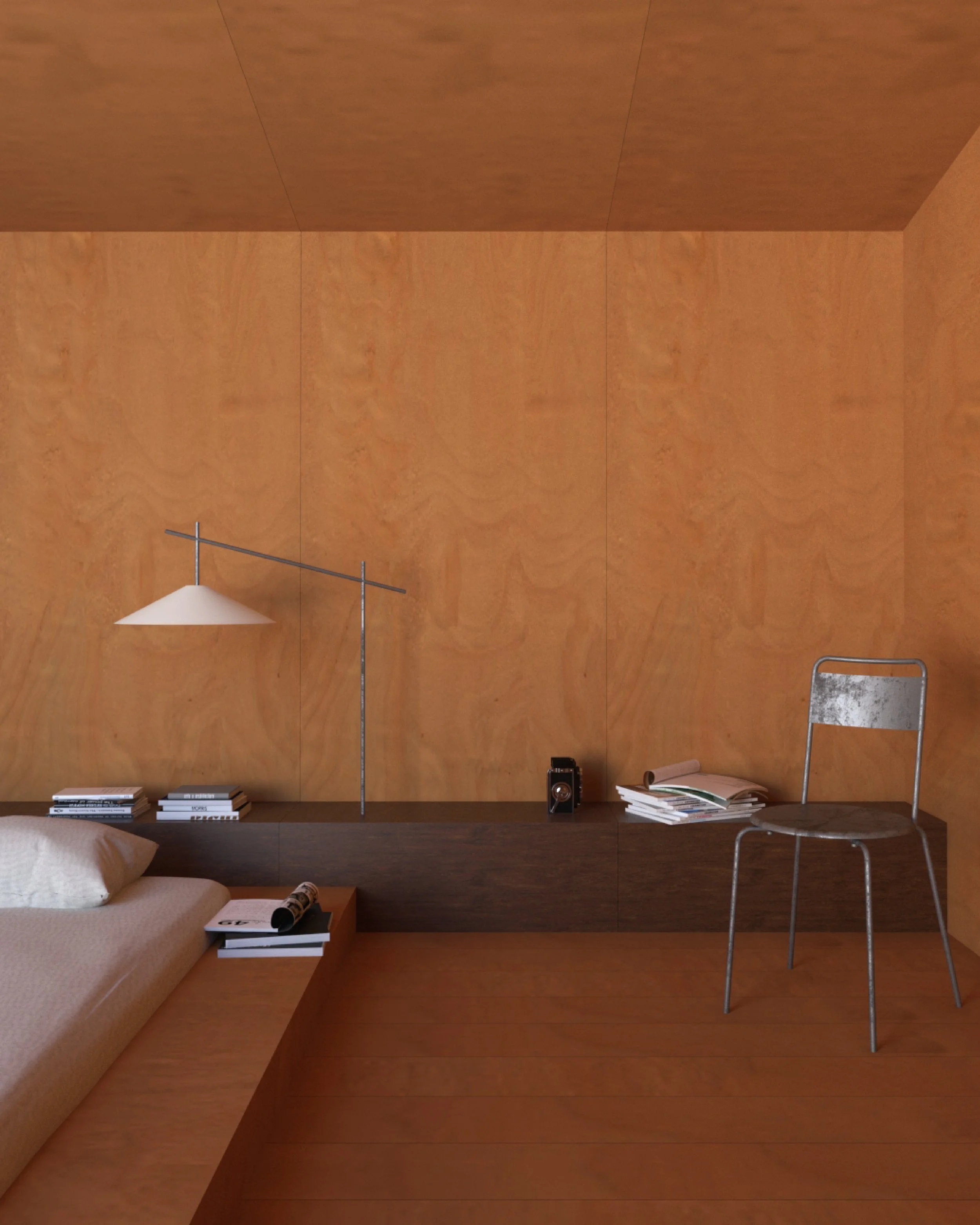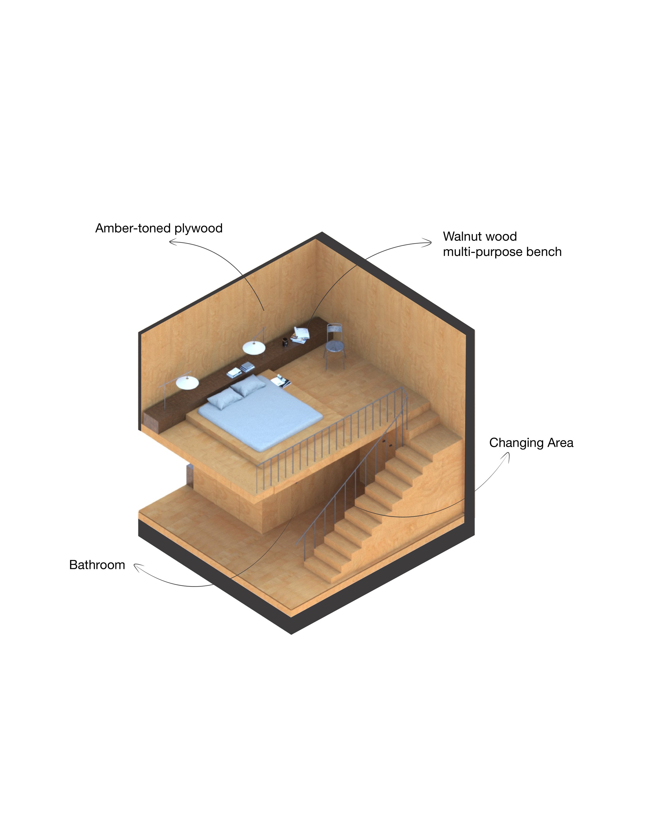 What if it was all wood? A two-level bedroom exploring material continuity and spatial flow. Amber-toned plywood envelopes the space, with a walnut bench adding contrast and function. The ground floor accommodates active daily routines (bathroom, changing area), while the upper bedroom level becomes a calm retreat. The staircase mediates between energy and rest. Connected through wood in varied expressions.