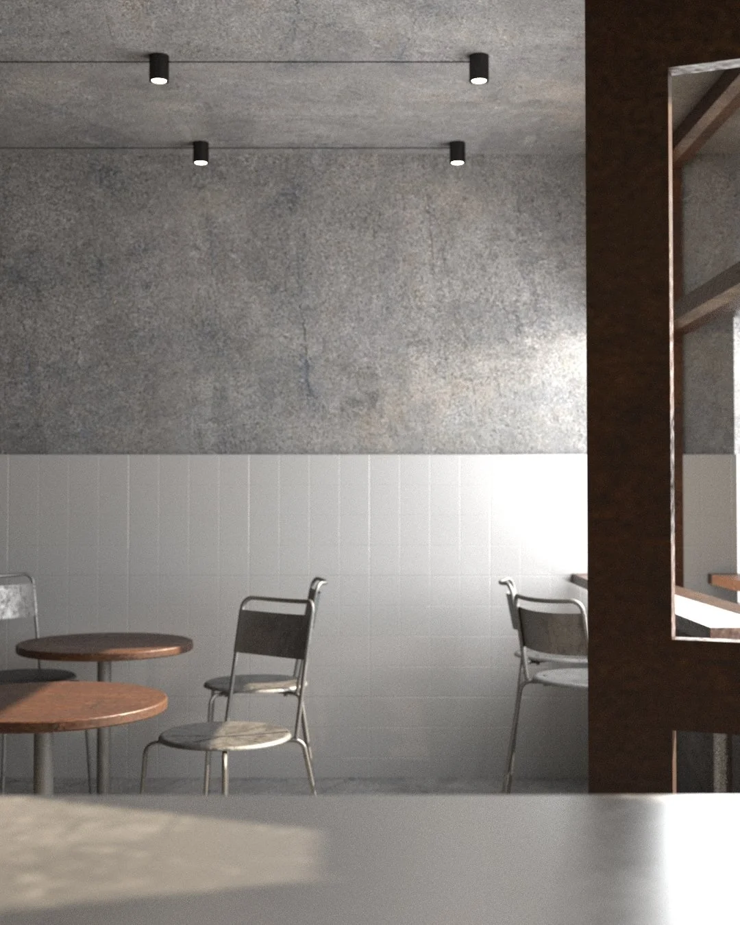 The lower walls are clad in vertical white ceramic tiles with a refined, grooved texture that adds depth and tactility to the space while providing a clean, luminous contrast to the raw concrete above. Simple wooden café tables are paired with sleek stainless steel chairs, their reflective metallic surfaces catching the light and adding an industrial elegance to the seating arrangement