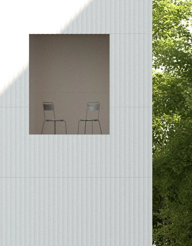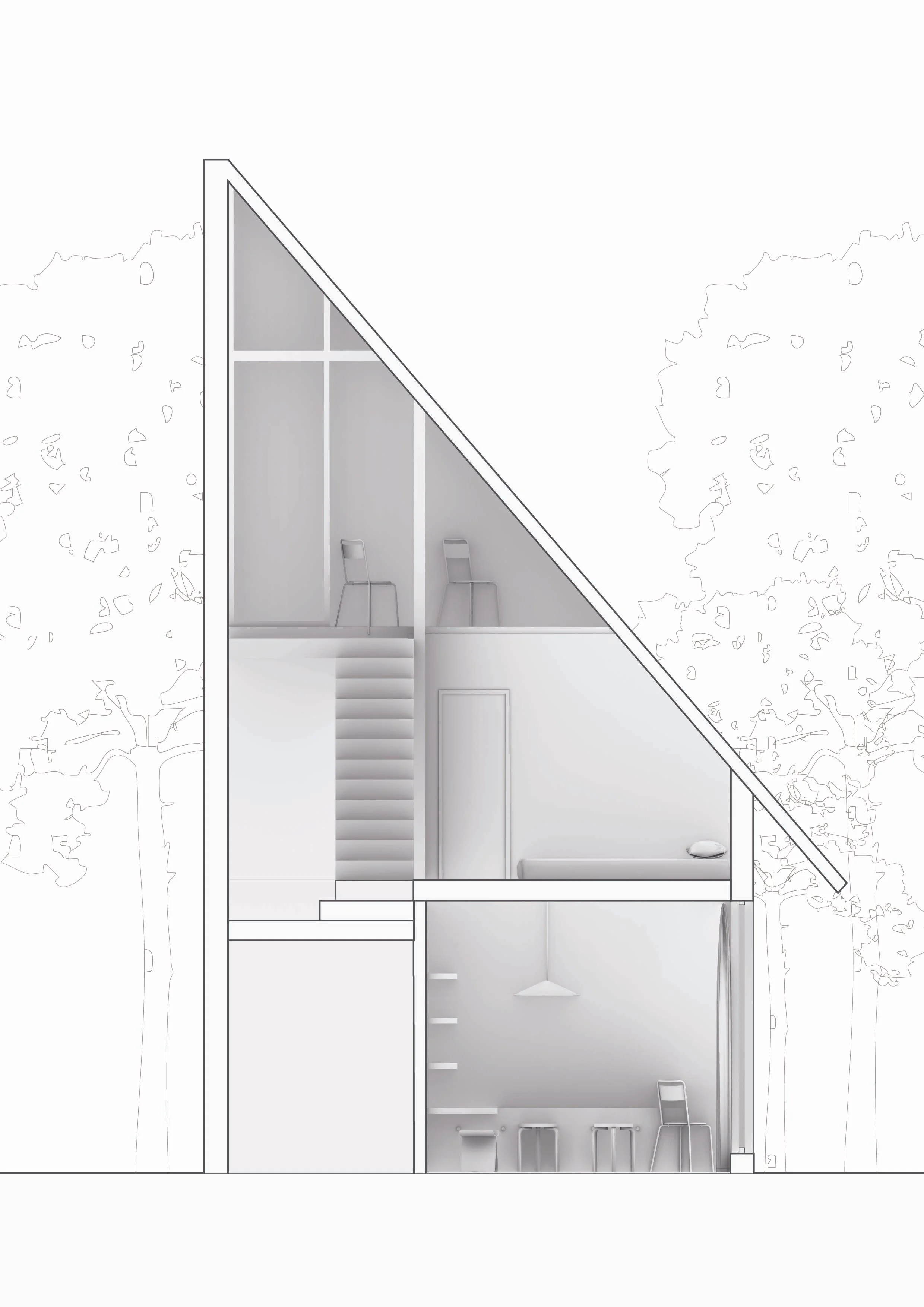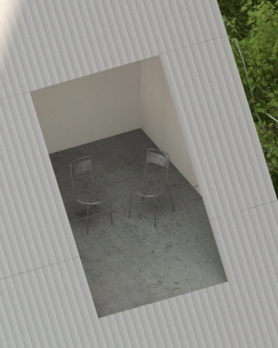 The inverted balcony that functions as a carved void within the volume. Rather than projecting outward, this space is carved into the mass of the building, creating a sheltered external room that frames the forest view.